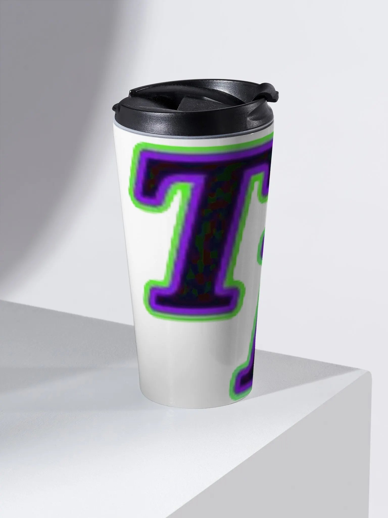 Sip in style with our stainless steel travel mug featuring a bold and glowing 'TR' typography design. Keep your beverages at the perfect temperature for hours, spill-free, while showcasing your unique style. Dishwasher-safe and customizable with all-over-print designs.
